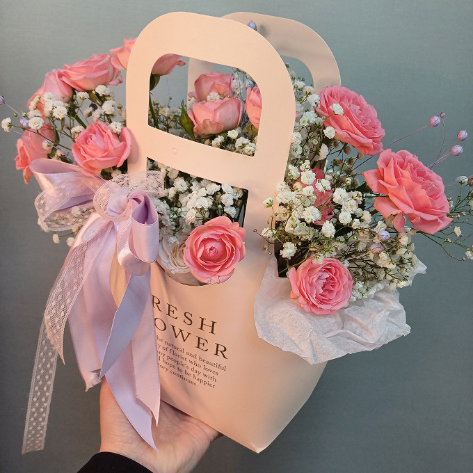 Гипсофила, Пиафлор / оазис/ флор. губка, роза кустовая, лен крашенный, сумочка картонная, лента