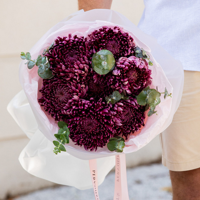 Хризантема одноголовая (ярко-розовый) — 7, эвкалипт — 5, оформление — 2, лента атласная — 1