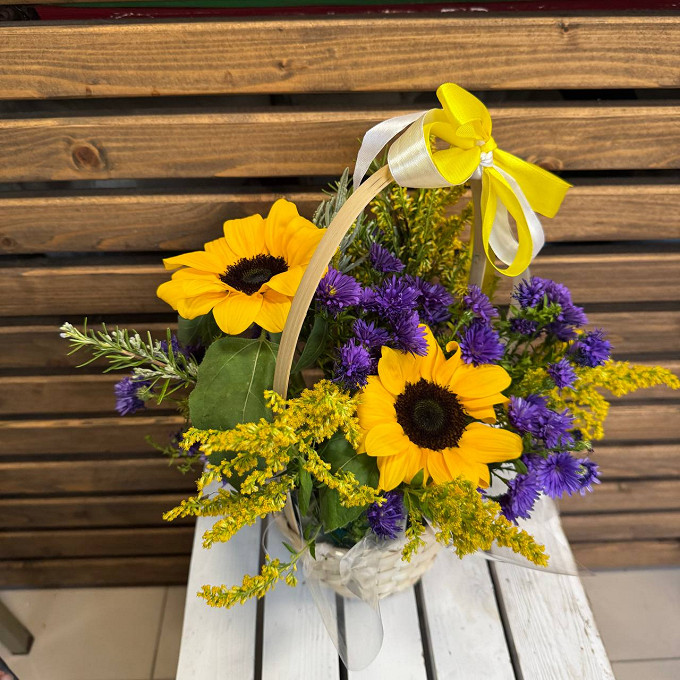 Корзина, Пиафлор / оазис/ флор. губка, подсолнух 2, сентябринки 5, зелень, лента